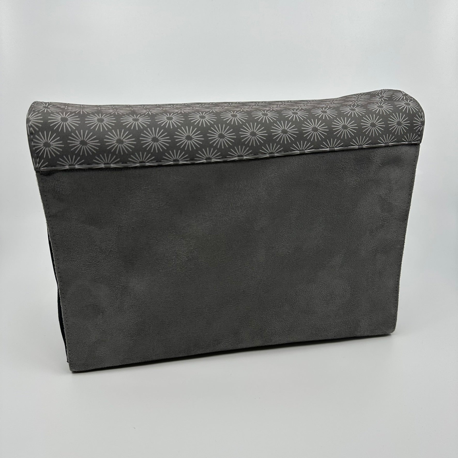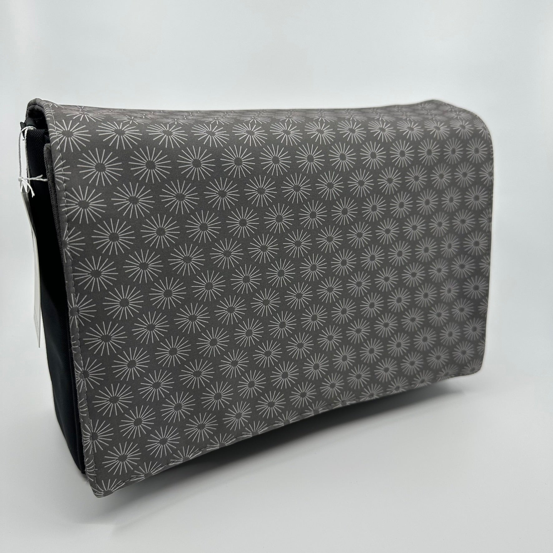 Dieses handgefertigte Cover für deine Wandeltasche besteht aus grauem Softshell-Stoff, verziert mit kleinen weißen Sonnen – ein stilvolles, wetterfestes Design mit Gute-Laune-Faktor! Das Material schützt deine Tasche zuverlässig bei Regen, Wind und im Alltag.
