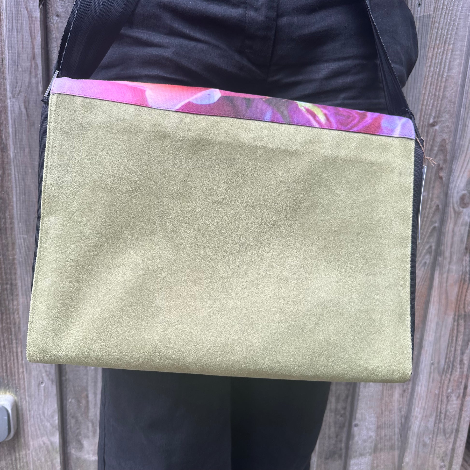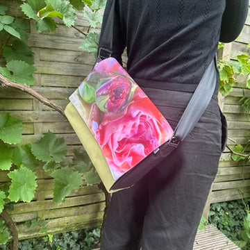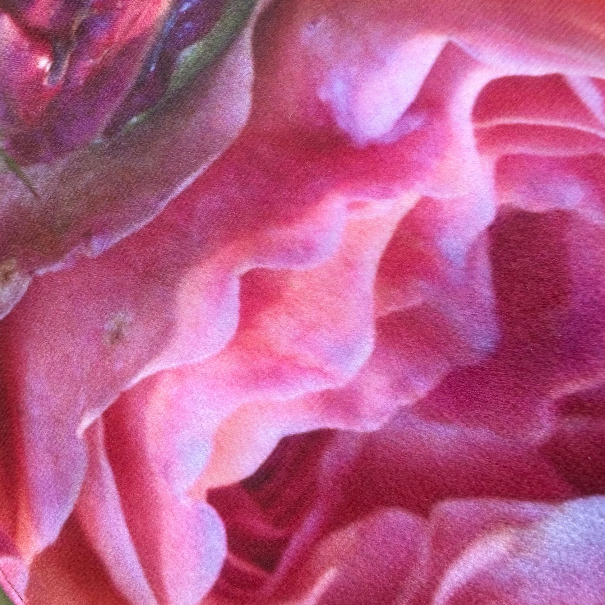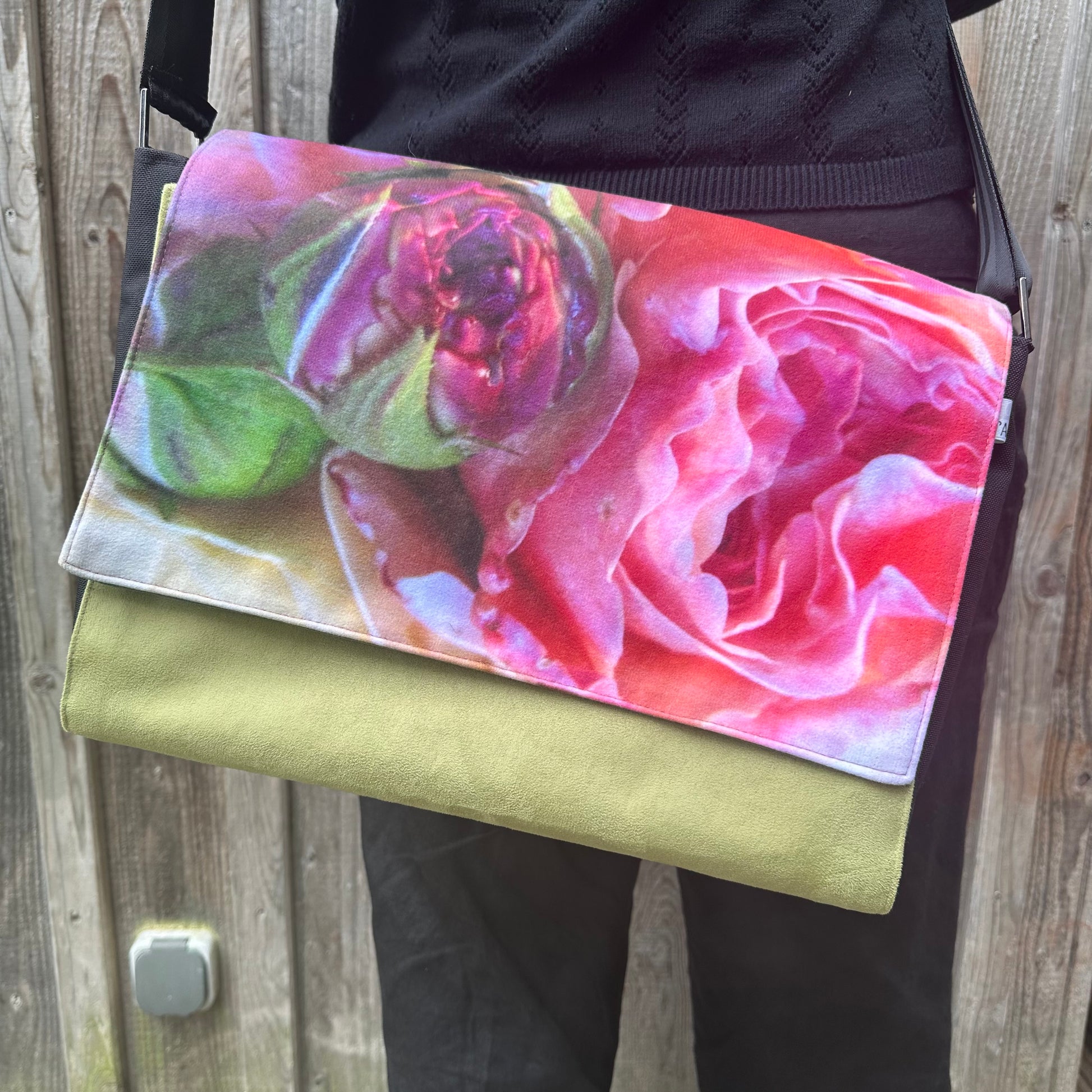 Dieses Motiv von Blüte und Blatt zeigt eine pinke Rosenblüte, die von einer Knospe und hellem Grün begleitet wird. Fotodruck auf Velours.