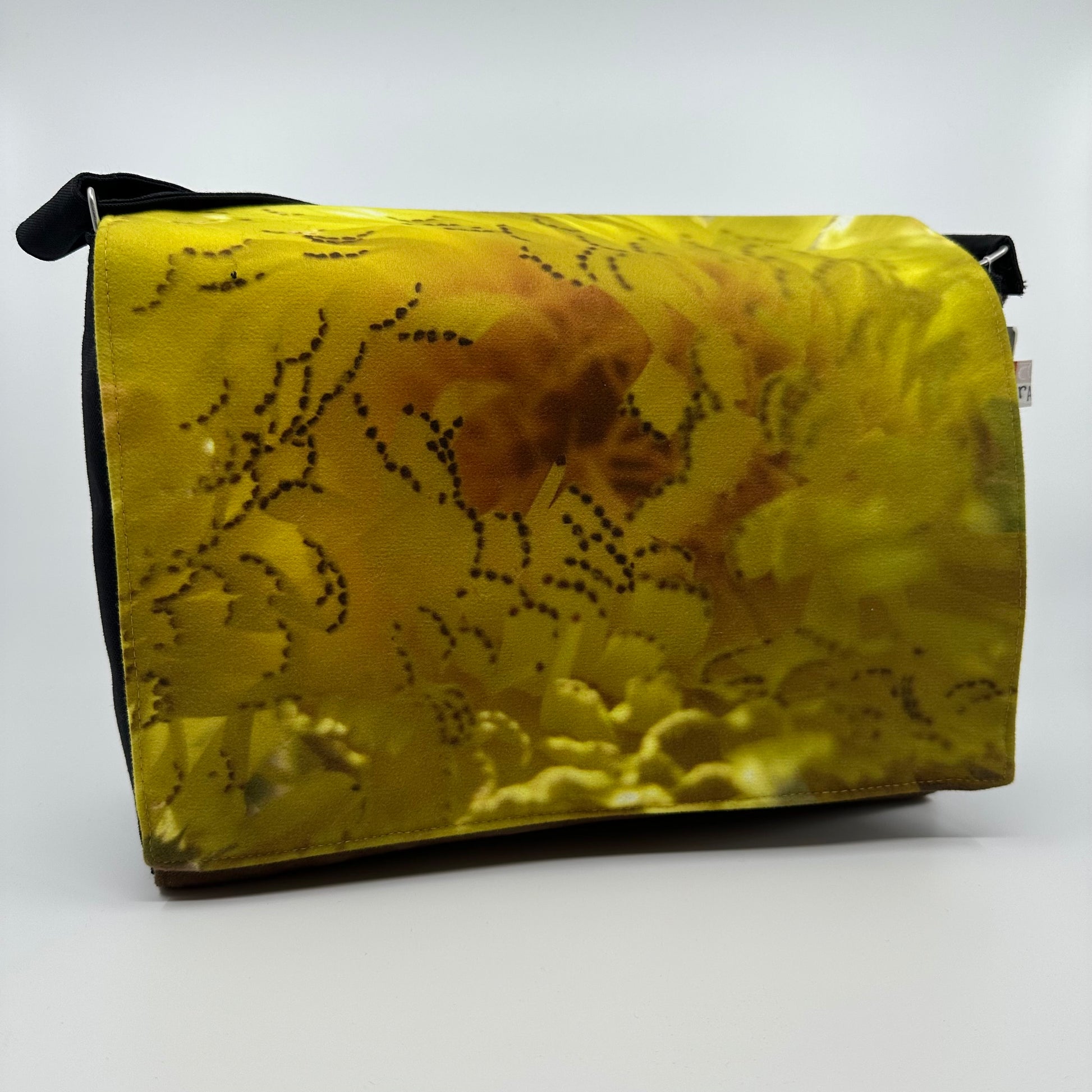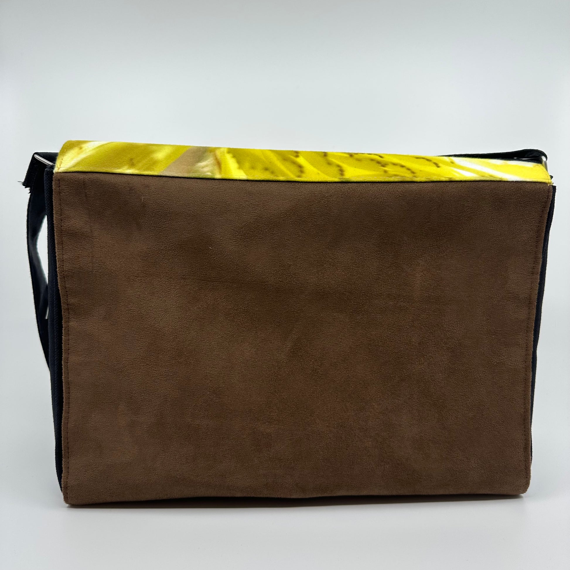 Dieses Velours-Cover kombiniert ein detailreiches sonnengelbes Fotomotiv von Blüte und Blatt mit hochwertigem, dunkelbraunem Velours.