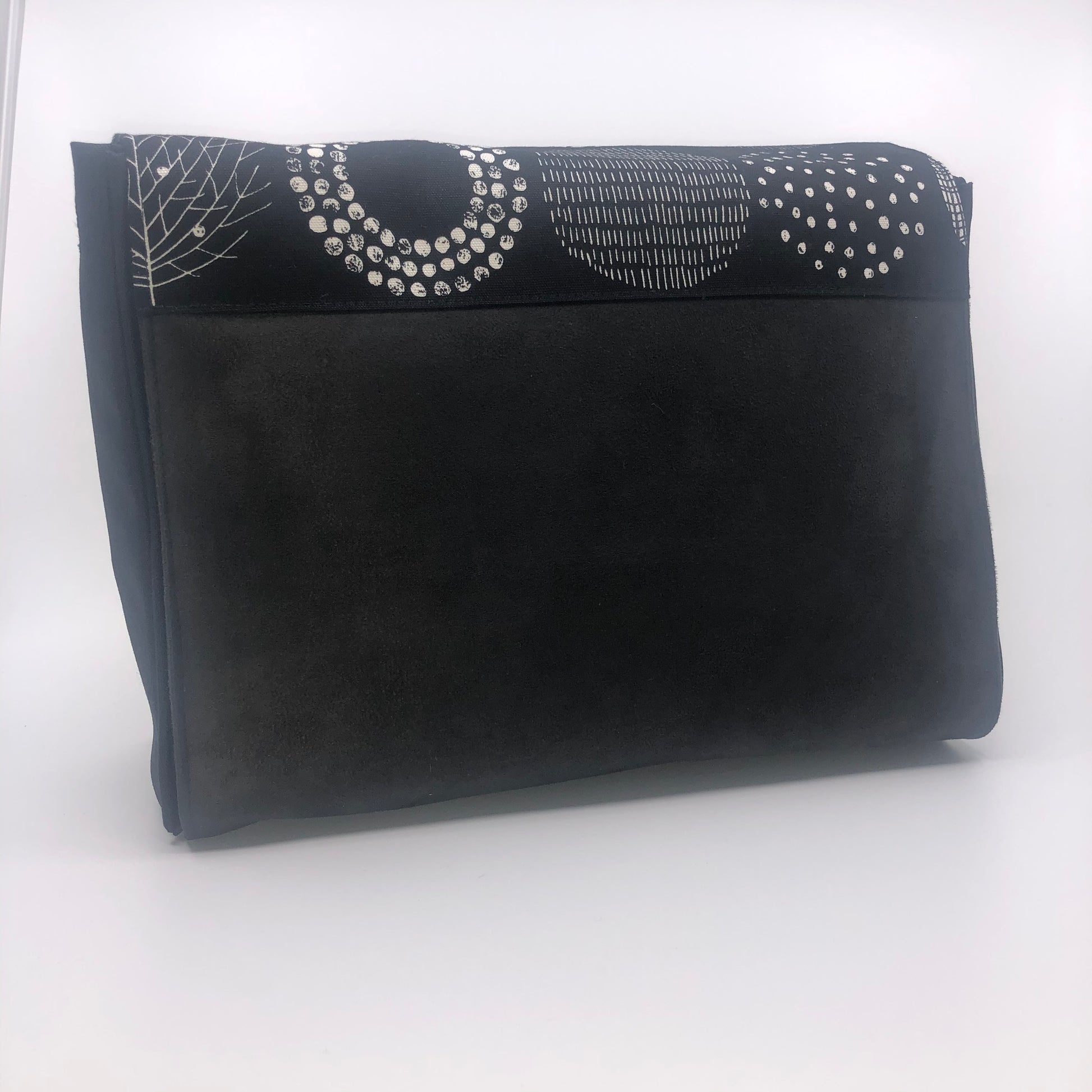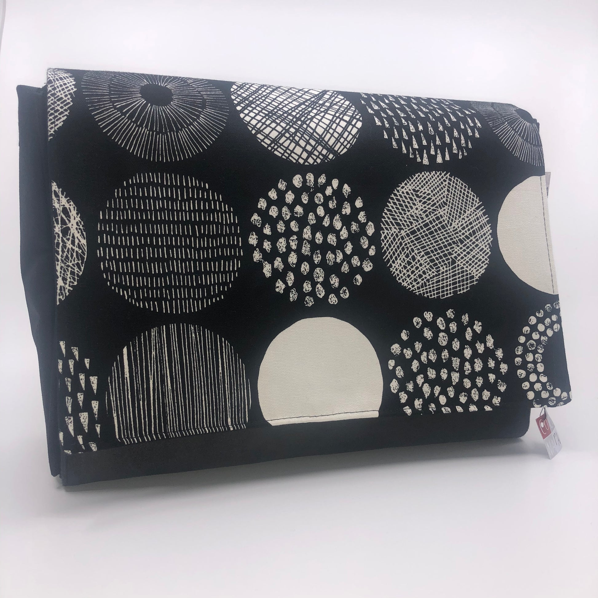 Dieses handgefertigte Cover überzeugt durch sein grafisches Design in Schwarz-Weiß: Punkte, Striche und weitere geometrische Elemente fügen sich zu einem Muster aus Kreisen. Ideal für Liebhaber von Grafik und Kontrasten.
