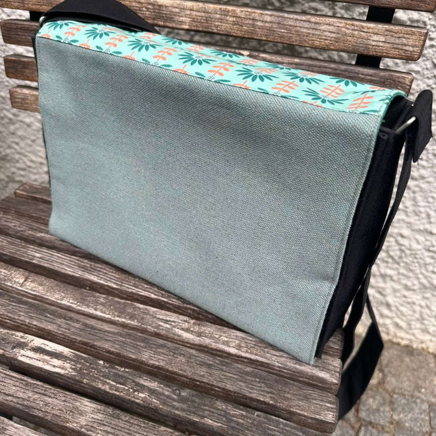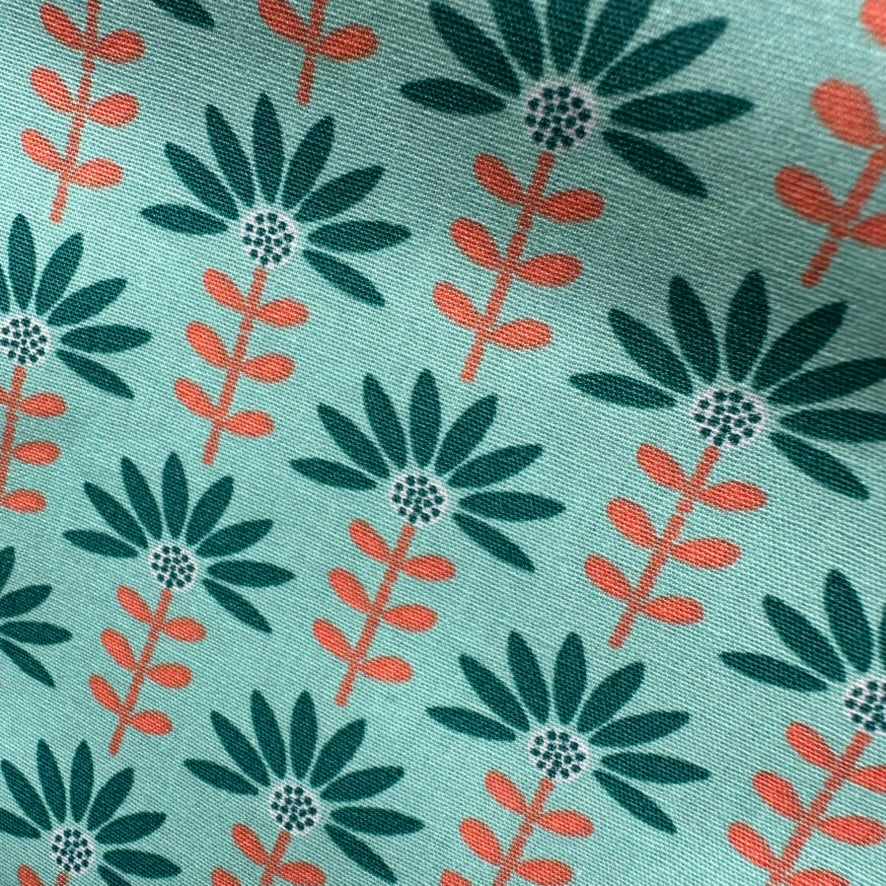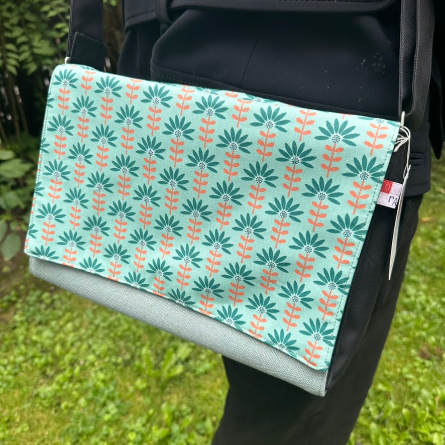 Gefertigt aus nicht glänzendem, wasserabweisendem Wachstuch in frischem Türkis schützt das Cover deine Tasche zuverlässig vor Nässe. Das auffällige Muster aus orangen geometrischen Blüten sorgt für einen lebendigen und trendigen Look.
