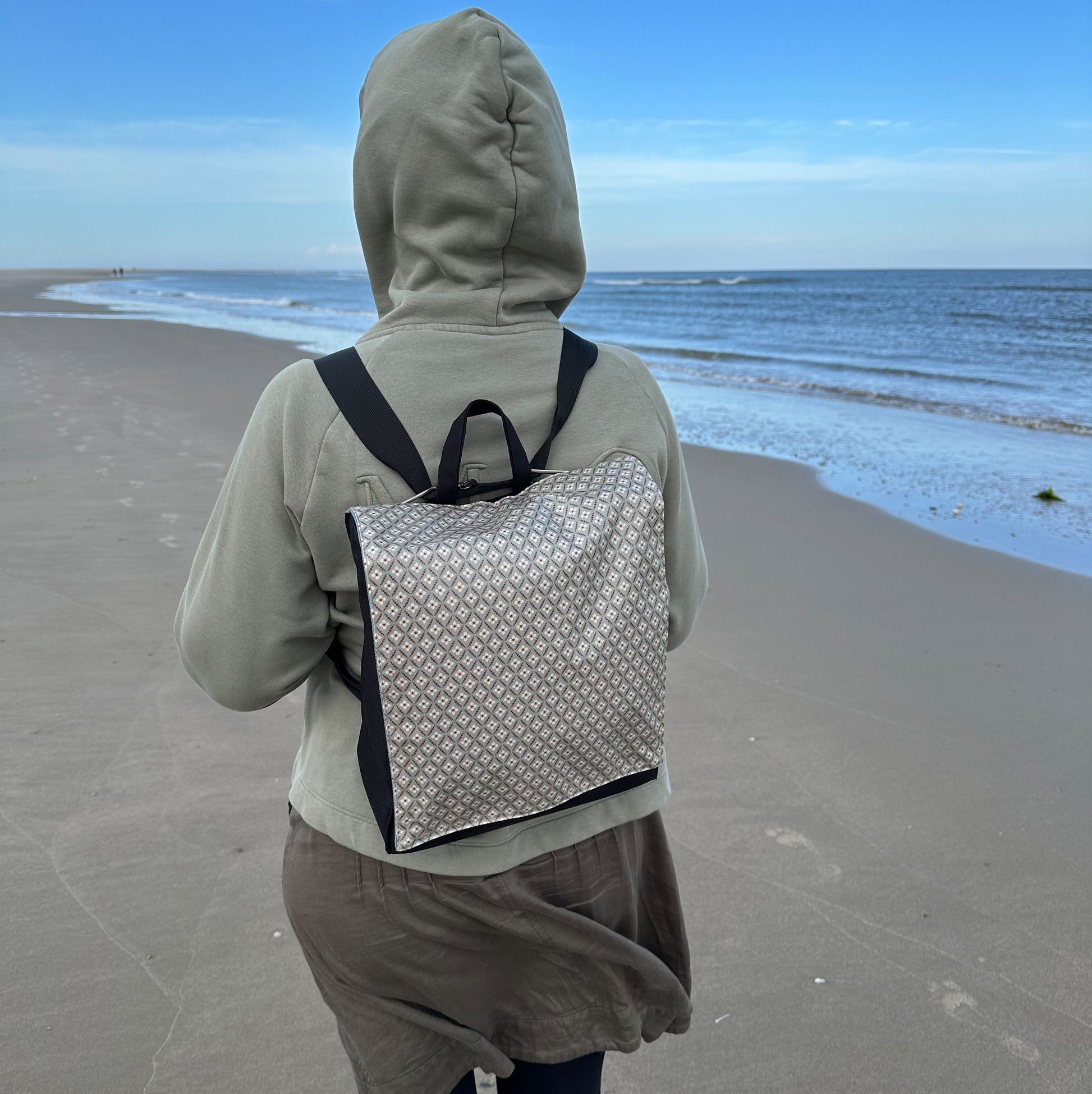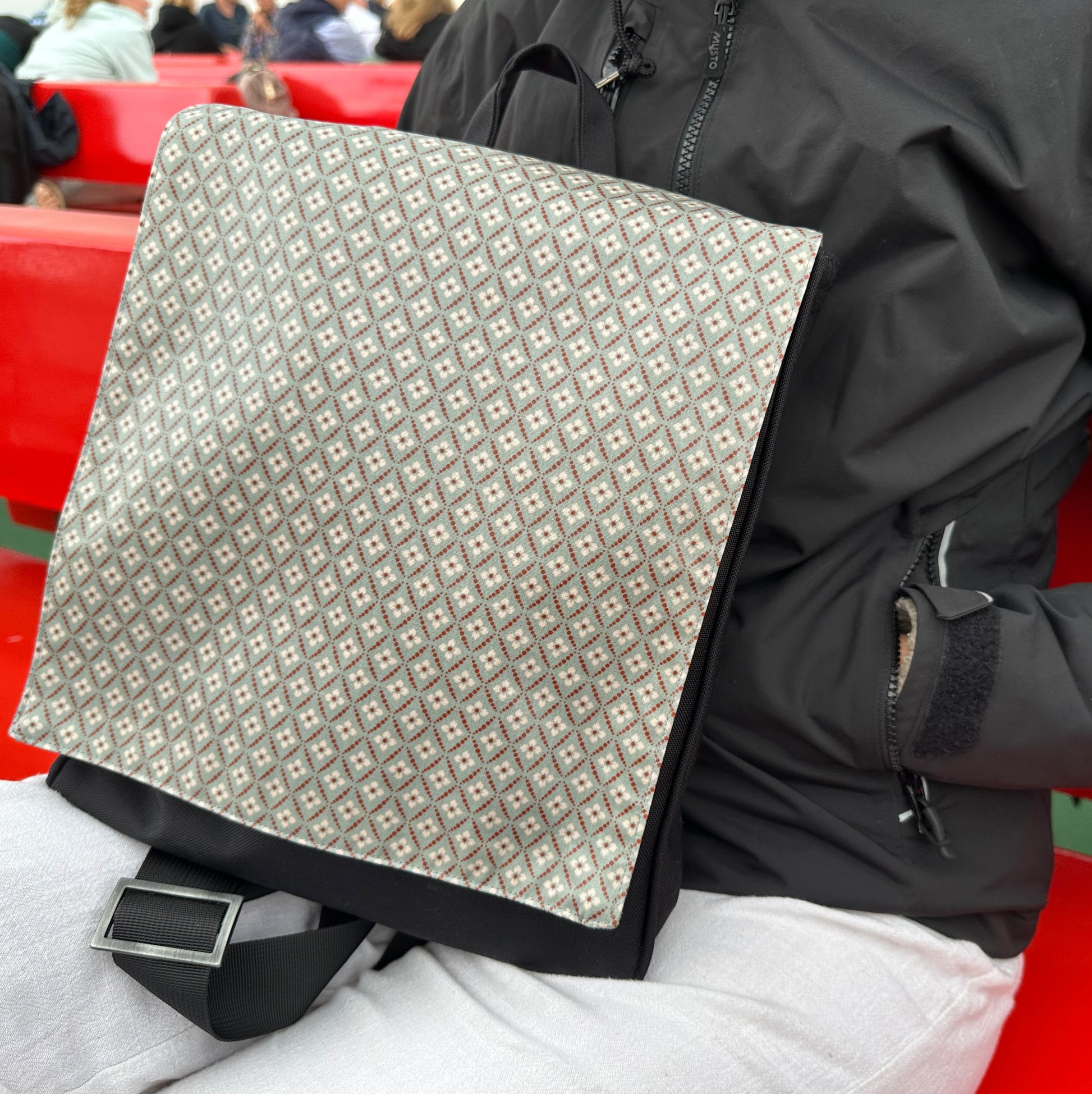 Dieses handgefertigte Cover für deinen Wandelrucksack besteht aus hellpetrolfarbenem Wachstuch, verziert mit weinroten Rauten und feinen weißen Blüten. Das Muster wirkt grafisch und feminin zugleich – ideal für alle, die sich bei jedem Wetter stilvoll und individuell zeigen möchten.