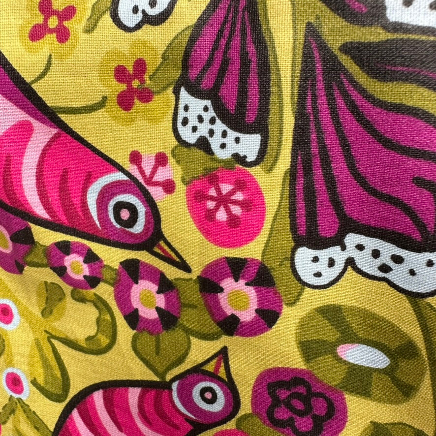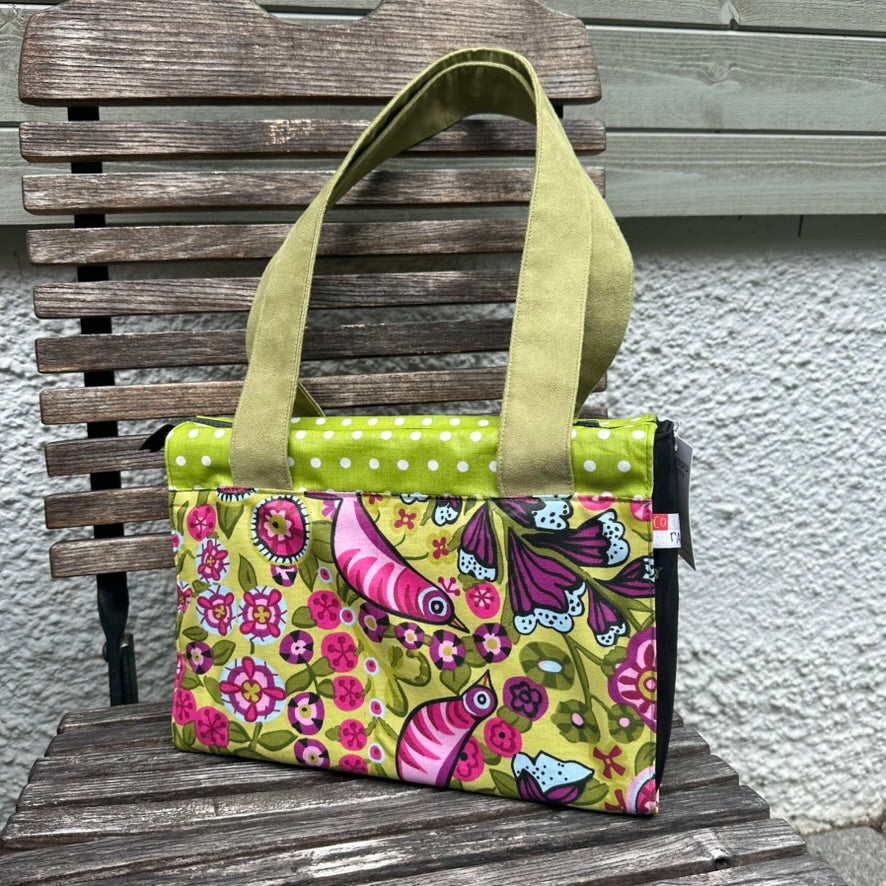 Bringe Farbe und gute Laune in deinen Alltag mit diesem handgefertigten Schultertaschen-Cover! Das verspielte Design kombiniert fröhliche, bunte Farben mit einem liebevollen Vogelmotiv und einem frischen grünen Pünktchenstoff.