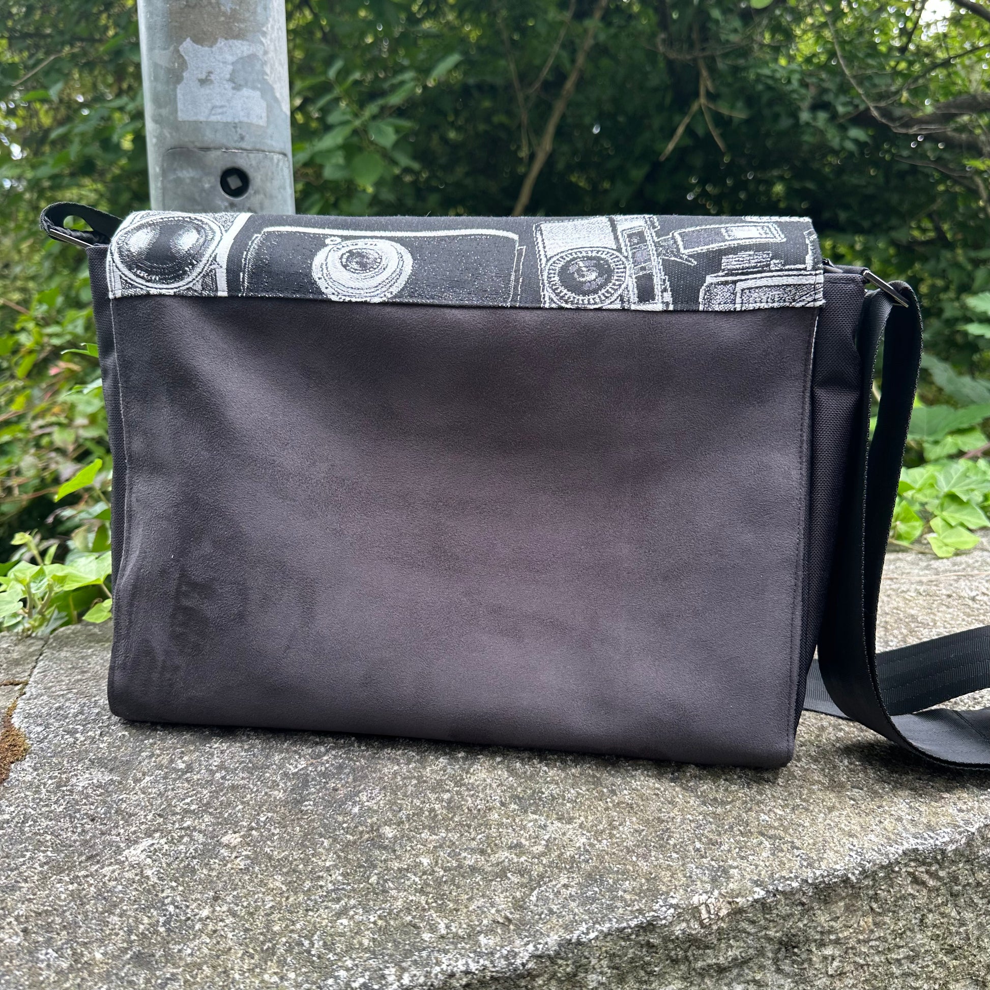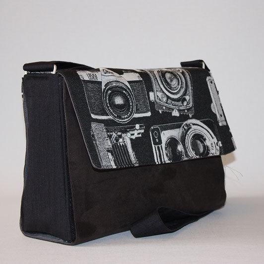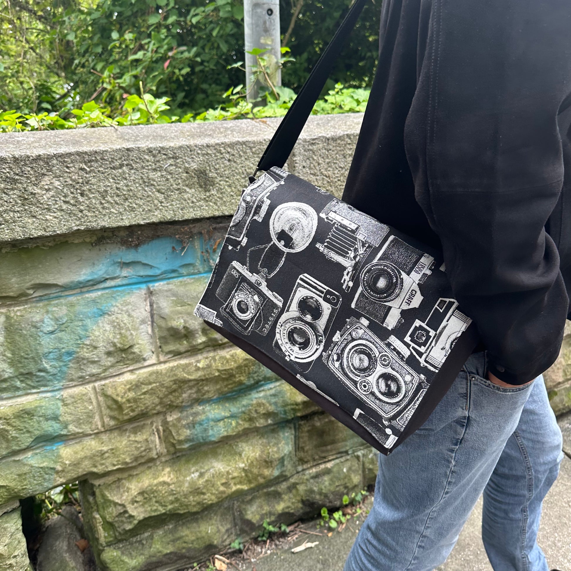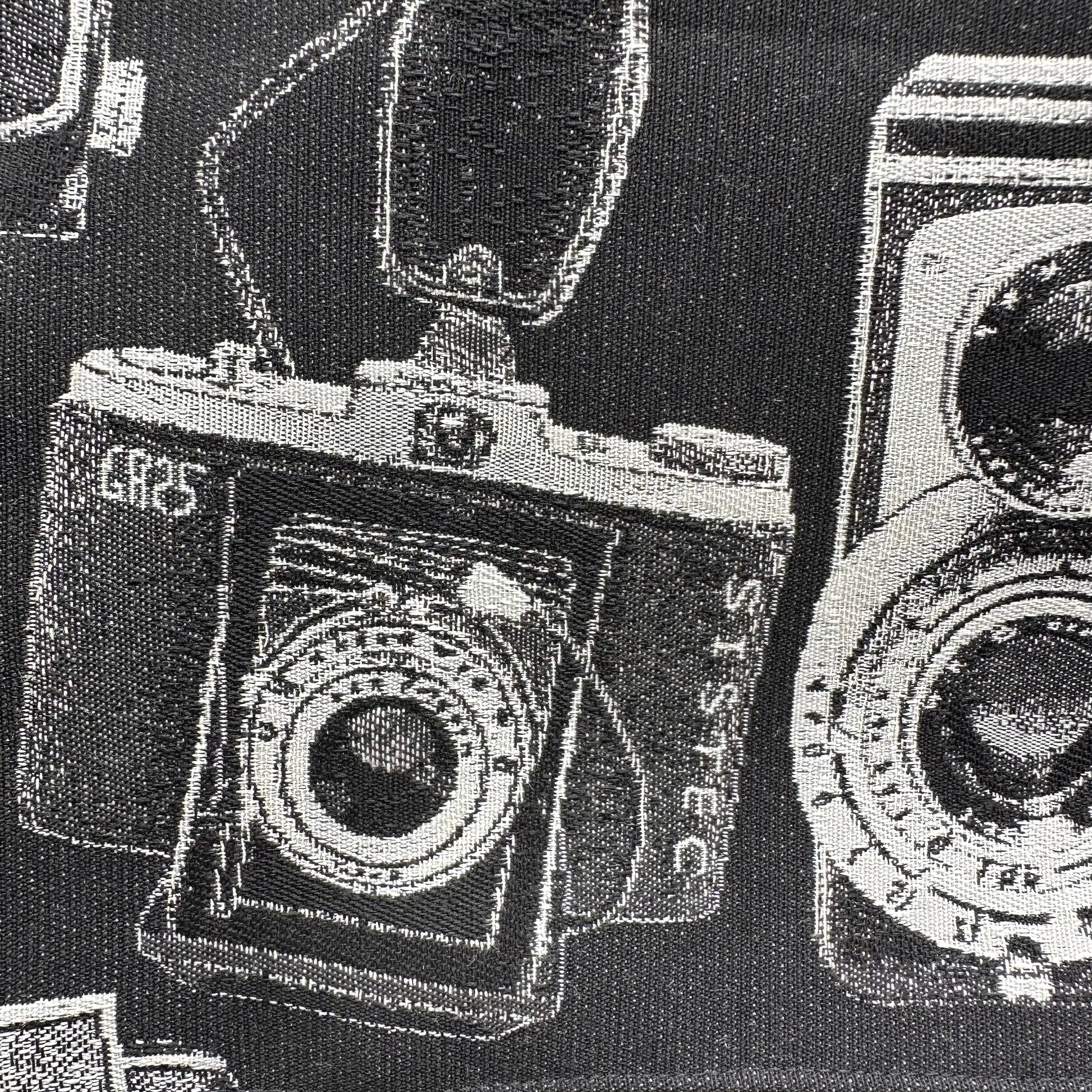 Setze ein Statement mit diesem einzigartigen Cover aus hochwertigem, robustem Jacquardstoff in tiefem Schwarz, verziert mit stilvollen weißen Motiven alter Fotoapparate. Perfekt für alle Fotografie-Liebhaber und Vintage-Fans.