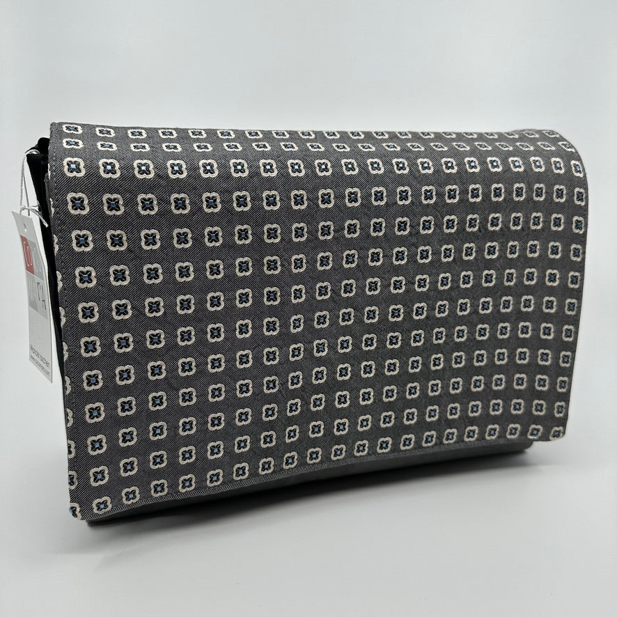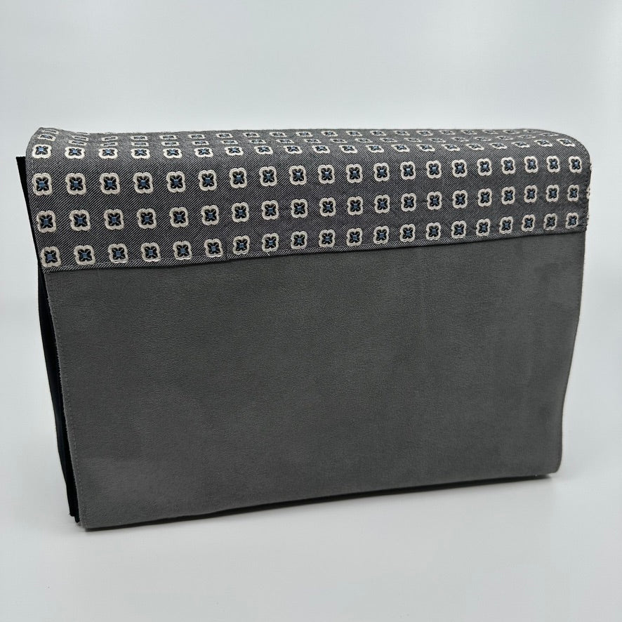 Dieses handgefertigte Cover für Wandeltaschen kombiniert leicht glänzenden grauen Stoff mit weiß - hellblauen, geometrisch angeordneten Quadraten mit hochwertigem grauem Velours. Das Ergebnis: Ein stilvoller Look mit klaren Linien, ideal für den Alltag und dennoch besonders.