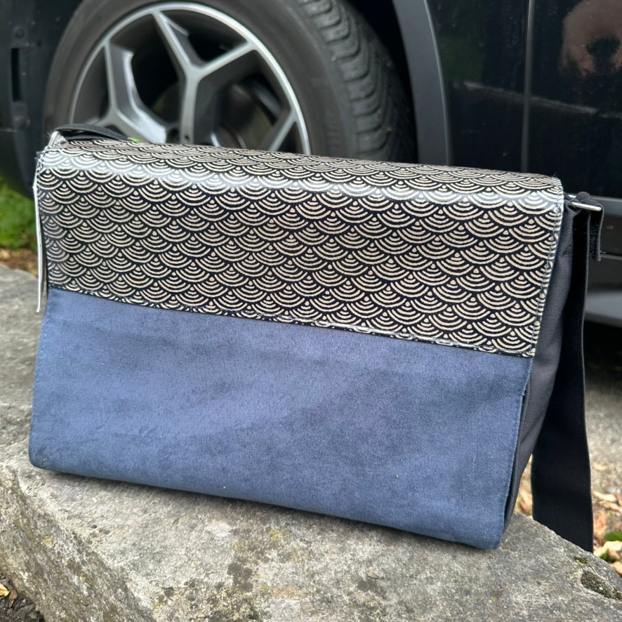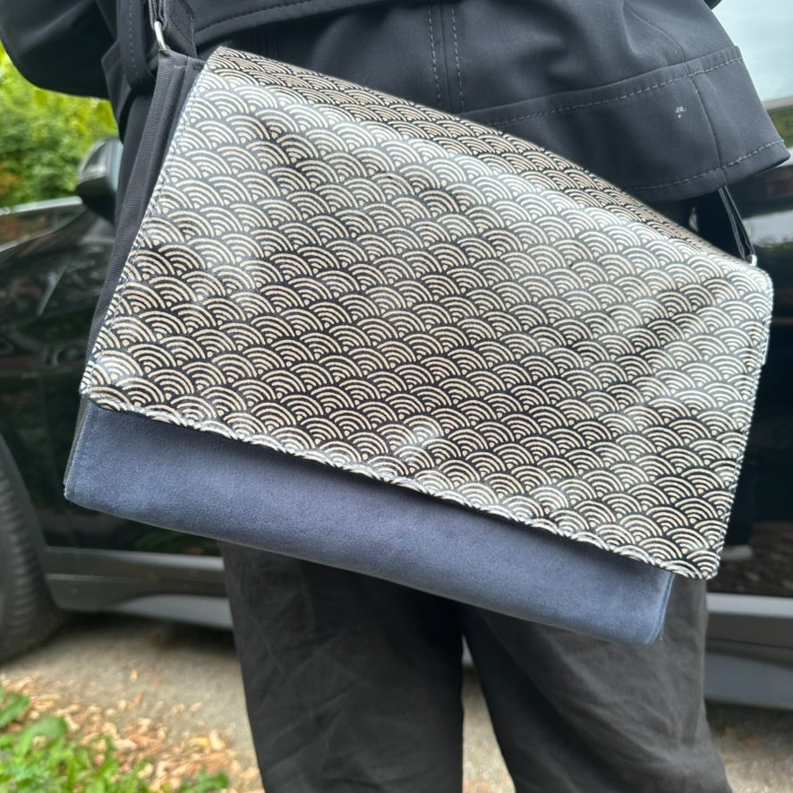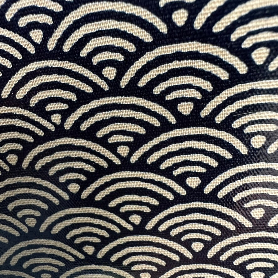Dieses Cover aus wasserfestem dunkelblauem Wachstuch, besticht es durch das klassische Seigaiha-Muster – stilisierte Bögen, die Wellen symbolisieren und für Ruhe sowie Beständigkeit stehen.